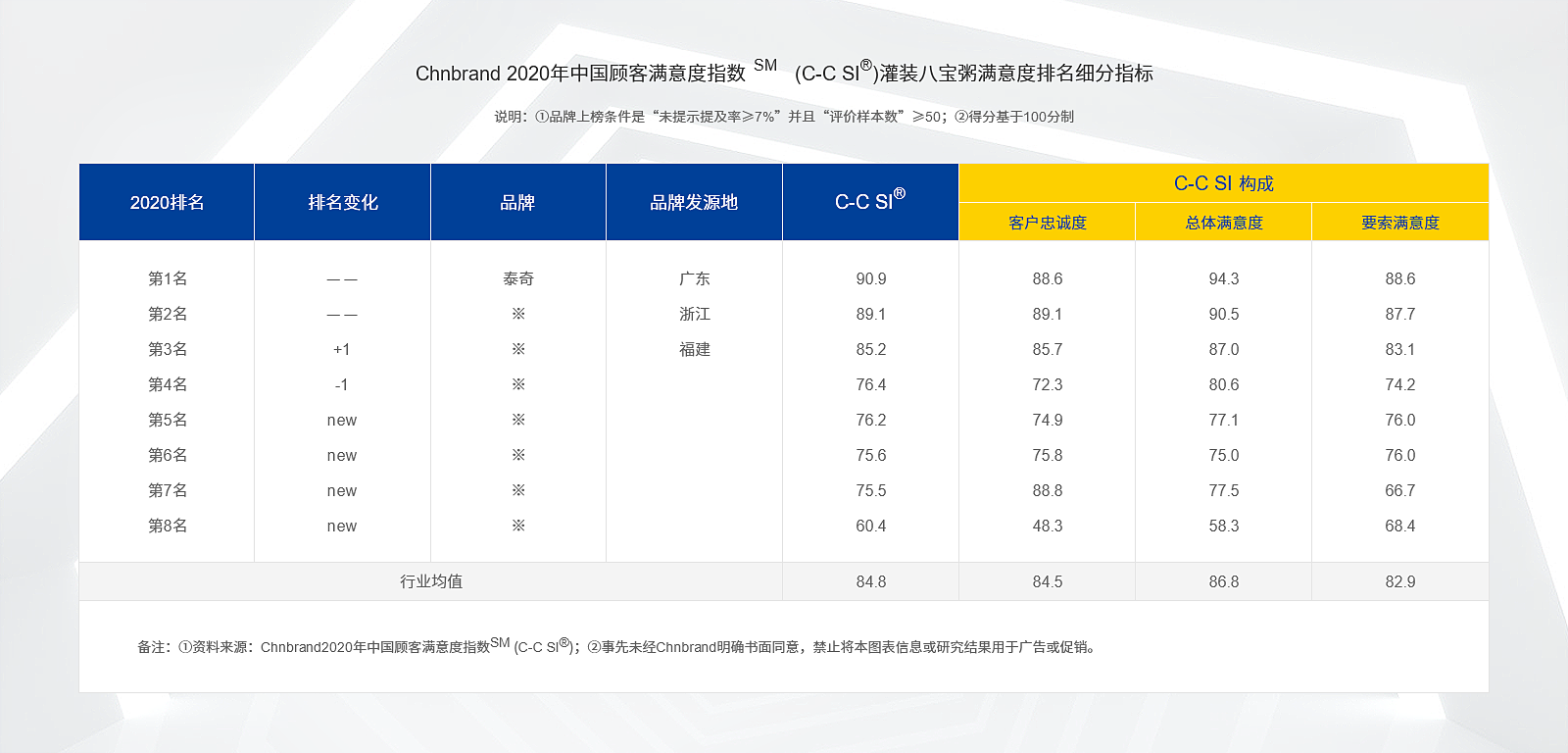 ? ? ? Chnbrand 品牌評級權威機構 發(fā)布的2020年(第六屆)中國顧客滿意度指數(shù)SM(C-CSI)品牌排名和分析報告,報告當中,泰奇食品(灌裝八寶粥),以中國顧客滿意度指數(shù)C-CSI 90.9? ,榮獲排行第一。